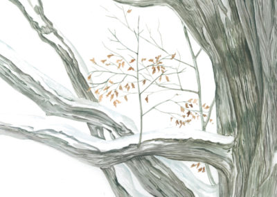 A life size study of a developing bud from a shrub planted in 1962 at Ardvorlich Estate, Perthshire. Capturing ‘new growth’ of spring, this study of a splendid, architecturally formed bud, each inflorescence still wrapped in its calyx, awaiting transformation. The large deep green shiny leaves, ideally steeply angled, ready to disperse any late spring snowfall from causing structural damage!