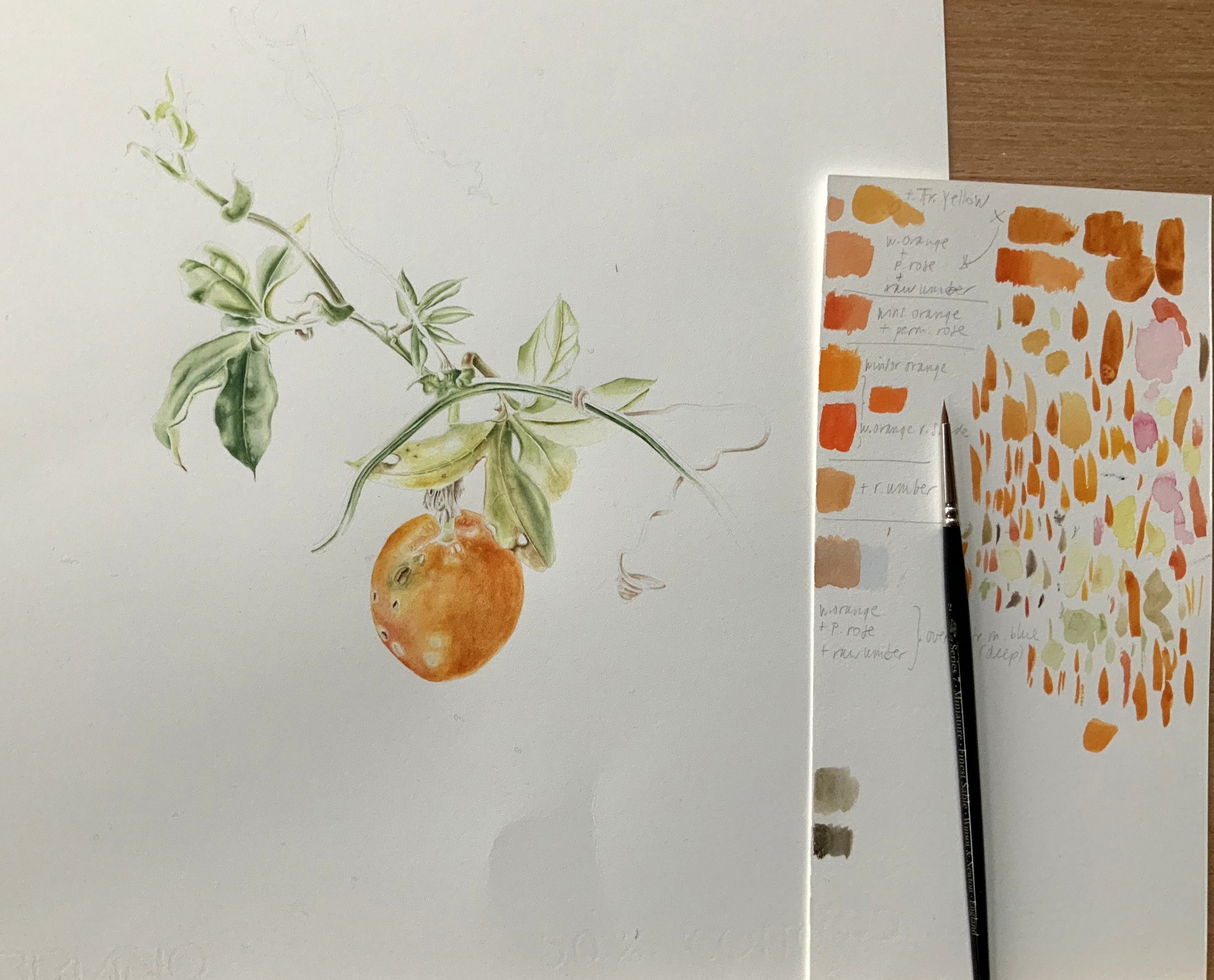 One day I discovered green and orange ‘balls’ between the green leaves: the fruit! Absolutely beautiful. I decided to go for a painting of a single fruit. I love to make sketches and studies. Quite often I use coloured pencils as well in my sketches but for a final painting I always use watercolours. I’m more comfortable with watercolours. It was not easy to capture the texture of the fruit. It doesn’t have a shiny skin with highlights. In this stage the fruit is getting a bit overripe and it has a pretty soft foamy skin. The orange colour is still vibrant though. By the time I started my painting the fruit was all gone. I had to draw from the photographs I had taken.