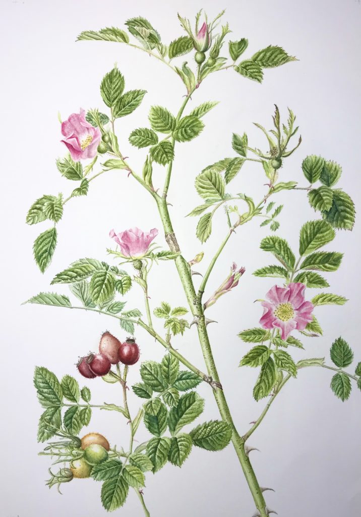I first started botanical art at an evening class at RBGE in 2008/9, with Alicia Salazar who helped me to produce a respectable watercolour painting of the black tipped bud of a branch from Fraxinus excelsior – the ash tree. Realising that I had a long way to go to learn how to draw plants and then use watercolours to paint flowers, I returned in 2011/12 to undertake two further courses in the evenings with Sharon Bradley and a day class with Louise Olley and Alicia. I was then encouraged to enrol on the Diploma in Botanical Illustration programme and I started in September 2012. In 2013 I produced a much better painting of Fraxinus excelsior that was included in the 2018 Flora Scotia exhibition at RBGE and included in the ‘Scottish Plant Lore’ book published by RBGE [Kenicer 2018].